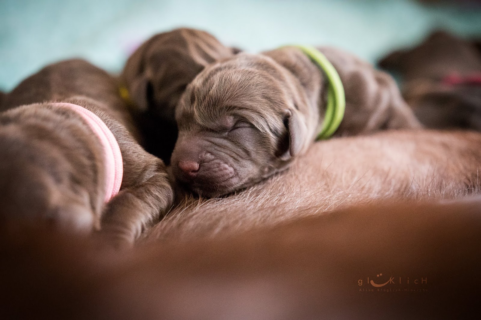 Pippa gönnt sich nun zwischen den Säugephasen auch mal etwas Ruhe und kühlt ihr Gesäuge auf den Fliesen. Die ersten Tage waren für sie anstrengend, heftige Nachwehen bereiteten ihr etwas Unruhe und auch um ihre Welpen war sie sehr besorgt und wollte sie keine Sekunde aus den Augen lassen. Jedes Quietschen, jeder Muks wurde von ihr kommentiert.